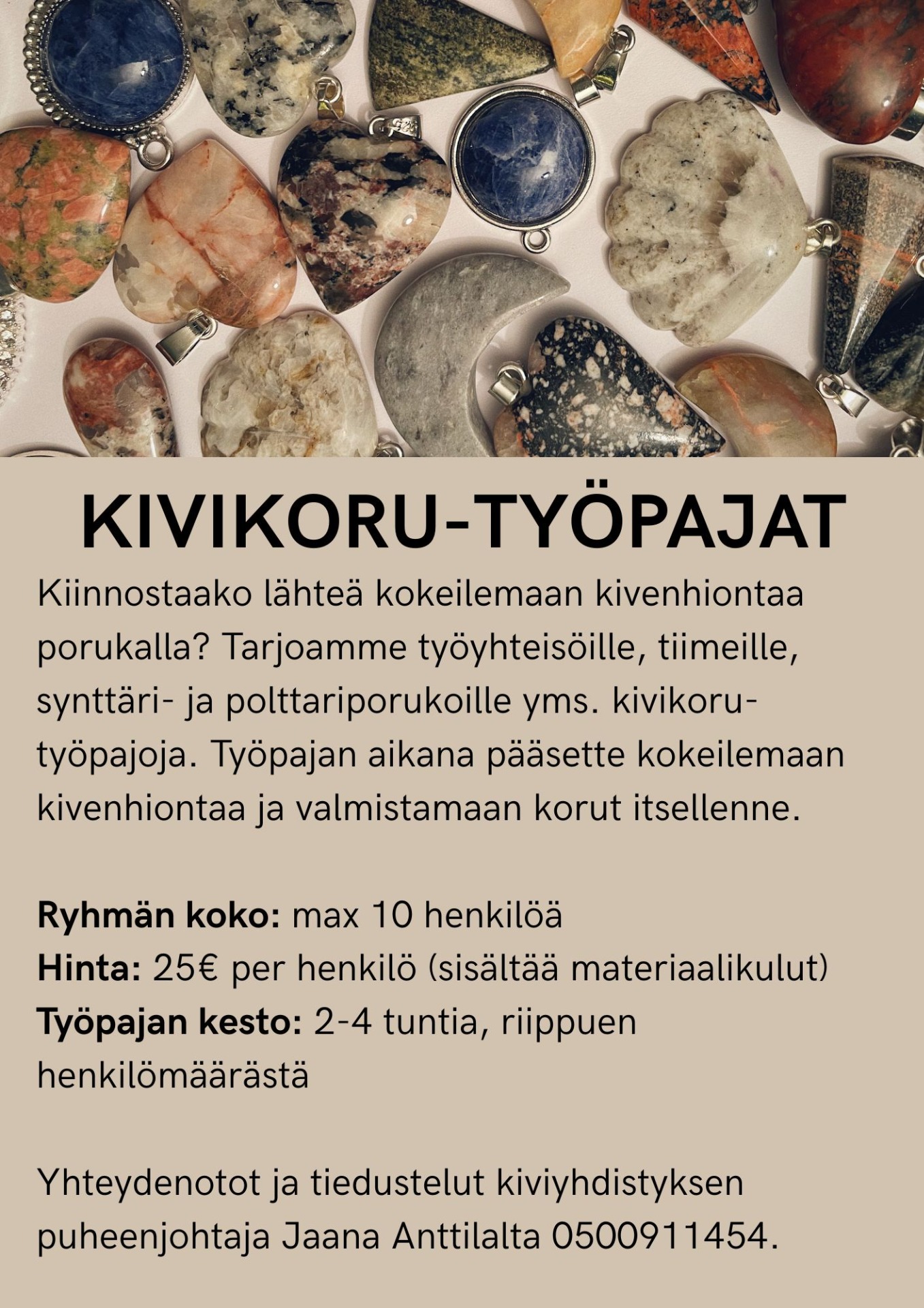 Kotkan seudun kiviyhdistys tarjoaa mahdollisuuden erilaisille ryhmille tulla tutustumaan kivenhiontaan ja koruntekoon. Työpajan voit varata ottamalla yhteyttä Kiviyhdistyksen puheenjohtaja Jaana Anttilaan 0500911454.